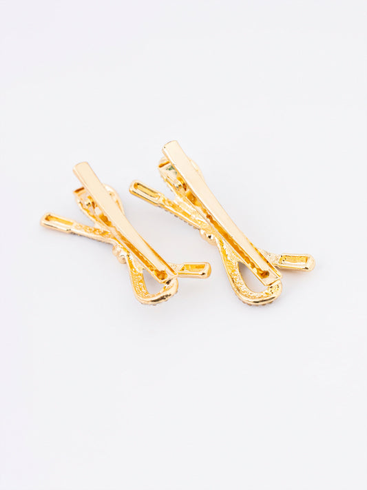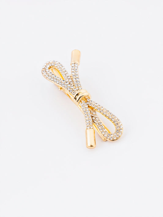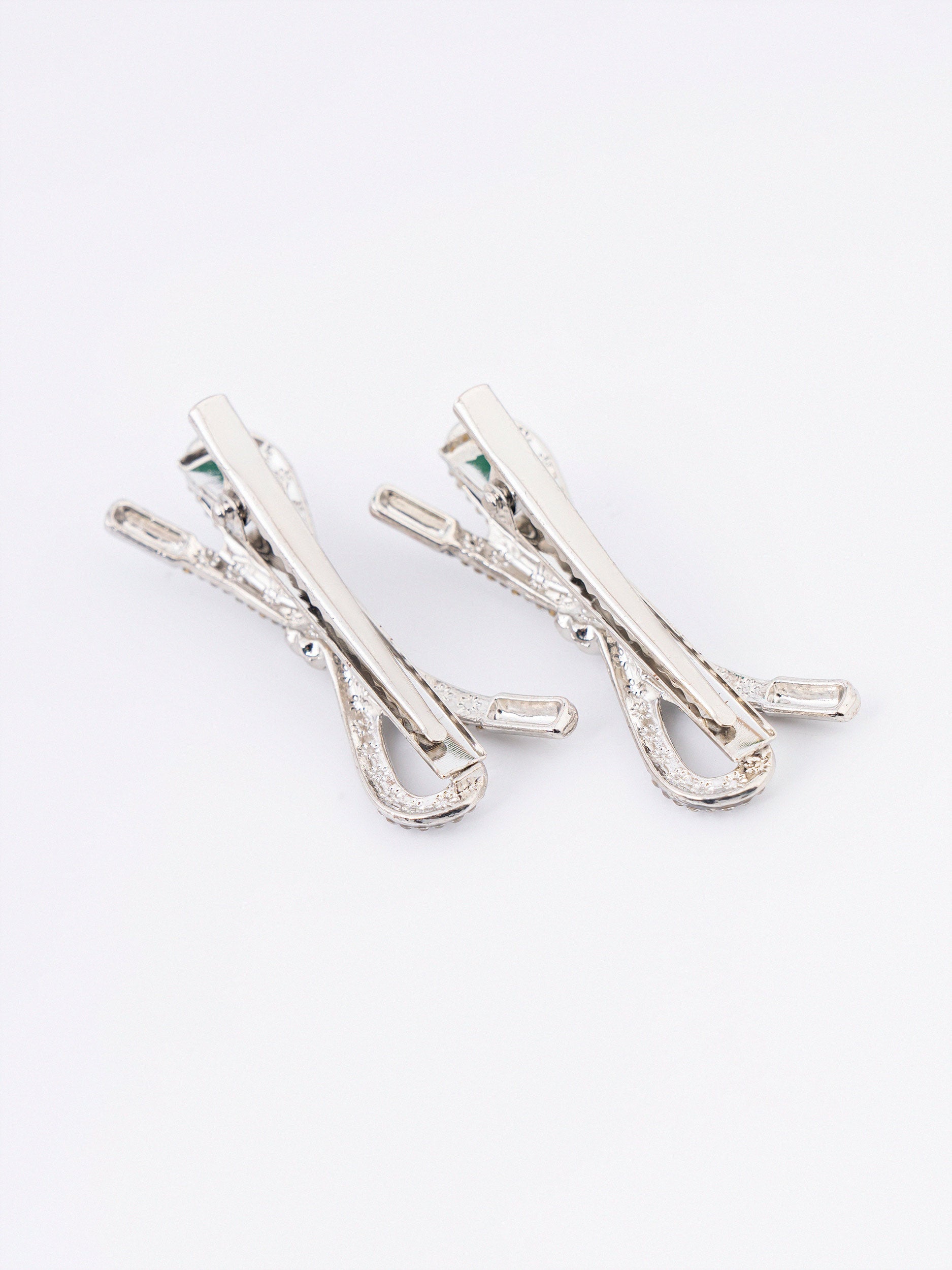 - Bow-style rhinestone embellished hair clips with snap closure