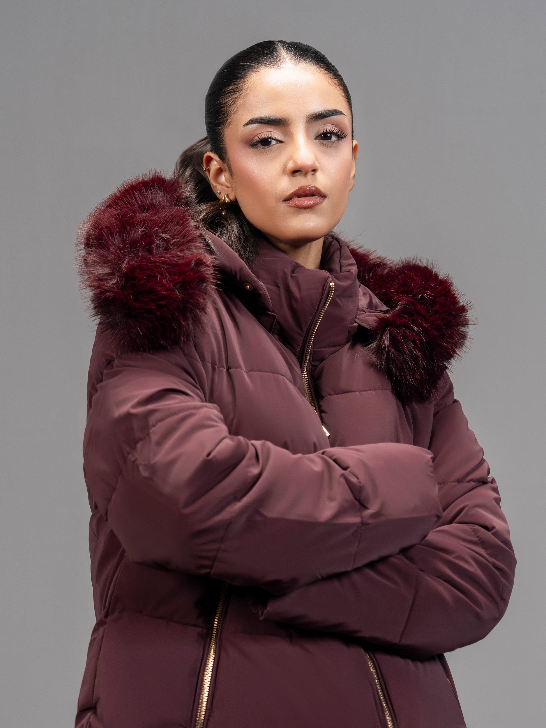 - Puffer jacket with side pockets, a zip closure, and a detachable fur hood