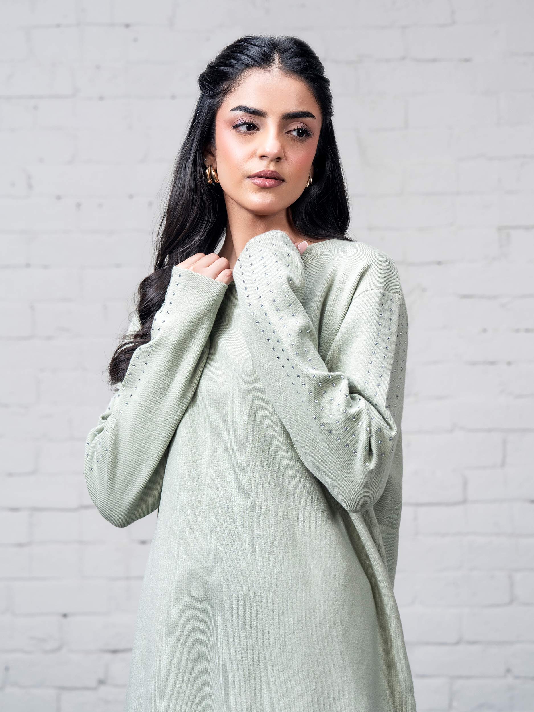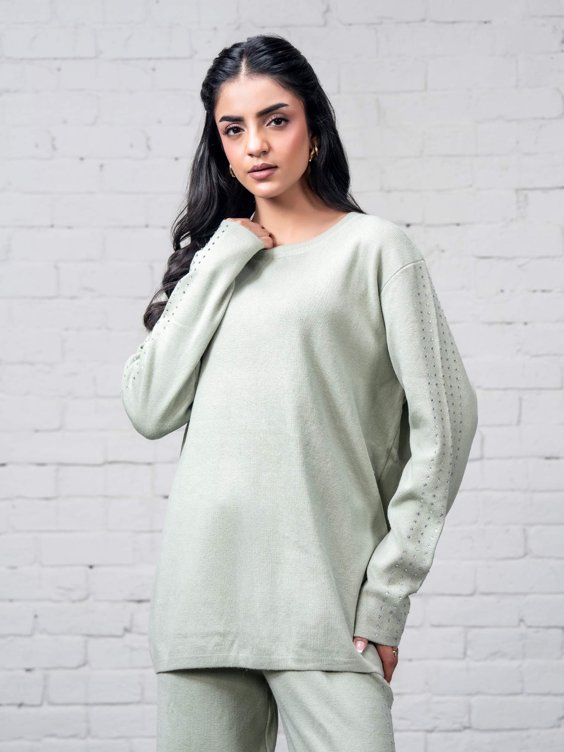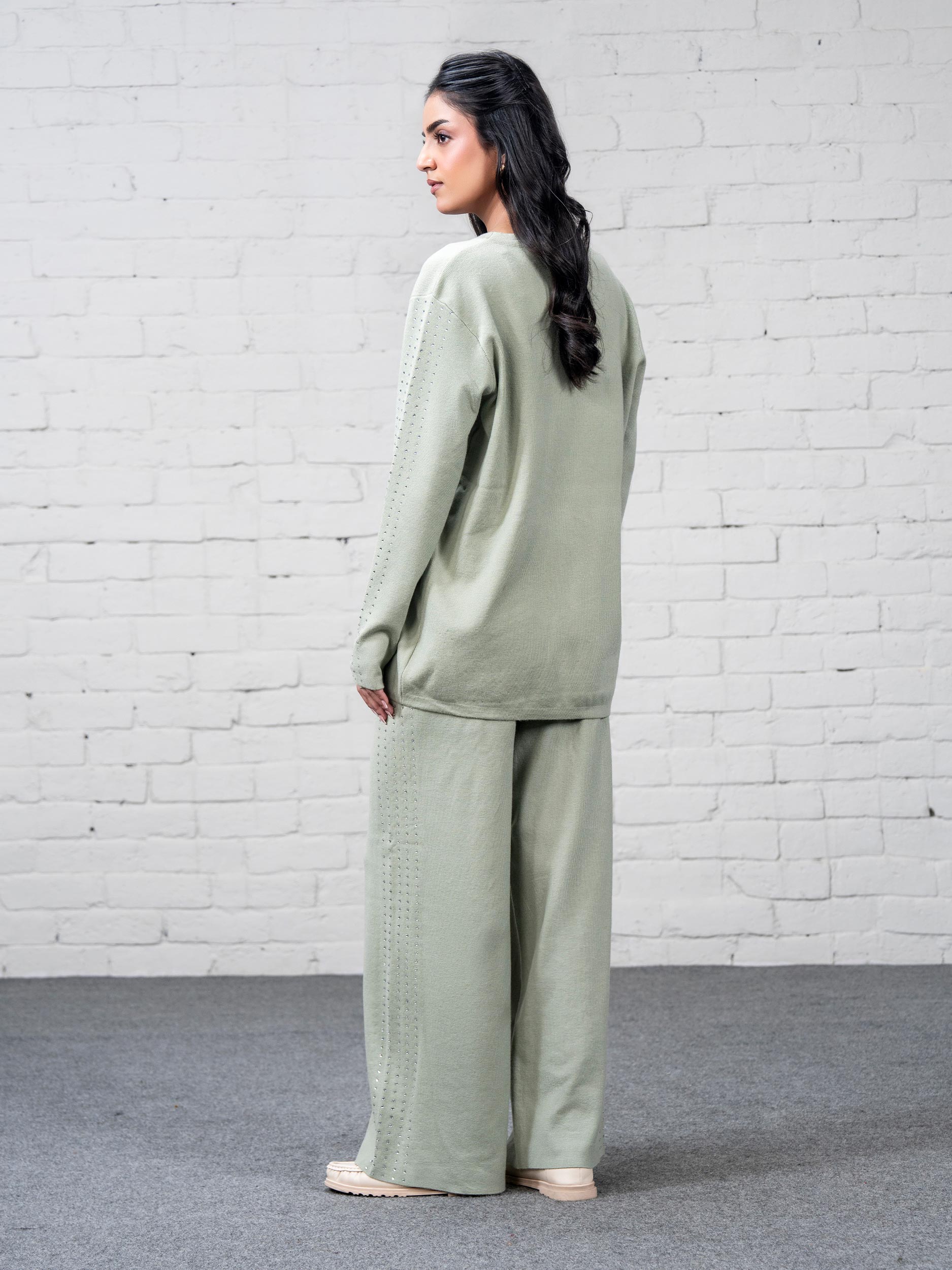 - Knitted wide-leg pants with side stone embellishments and elastic waistband