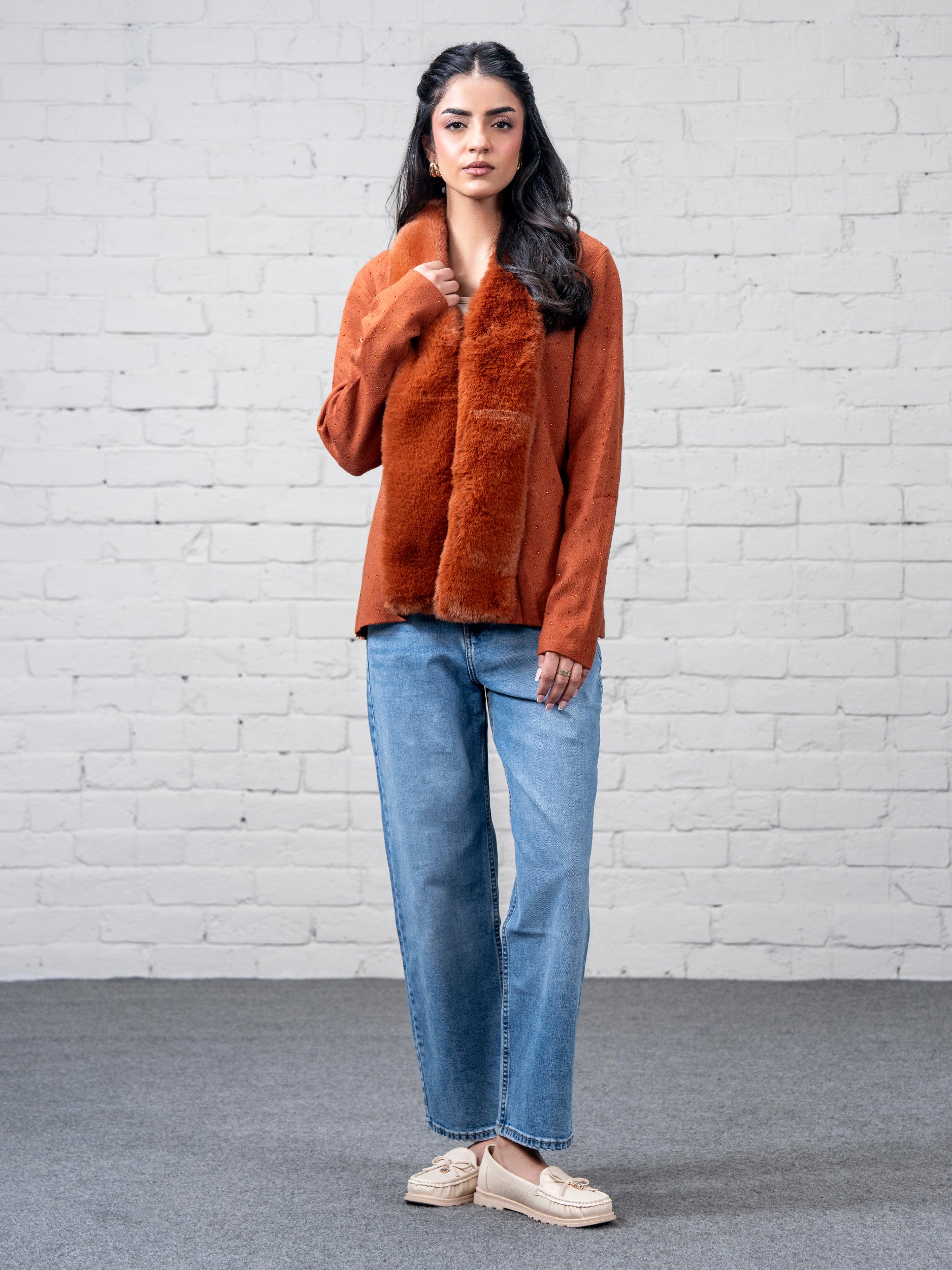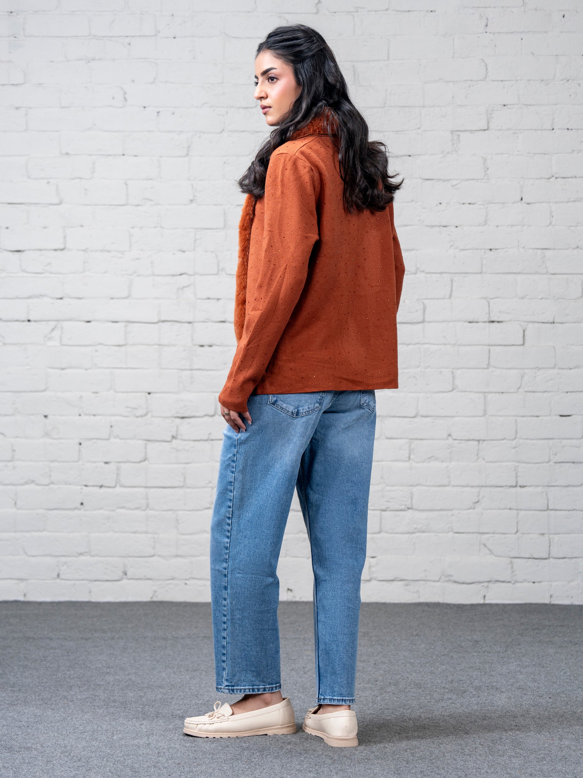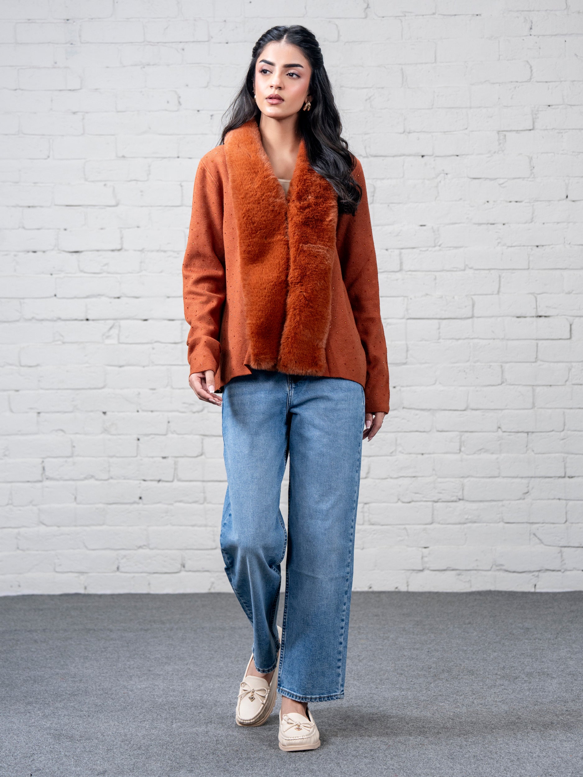 - Front-open stone embellished sweater with a soft faux-fur front trim