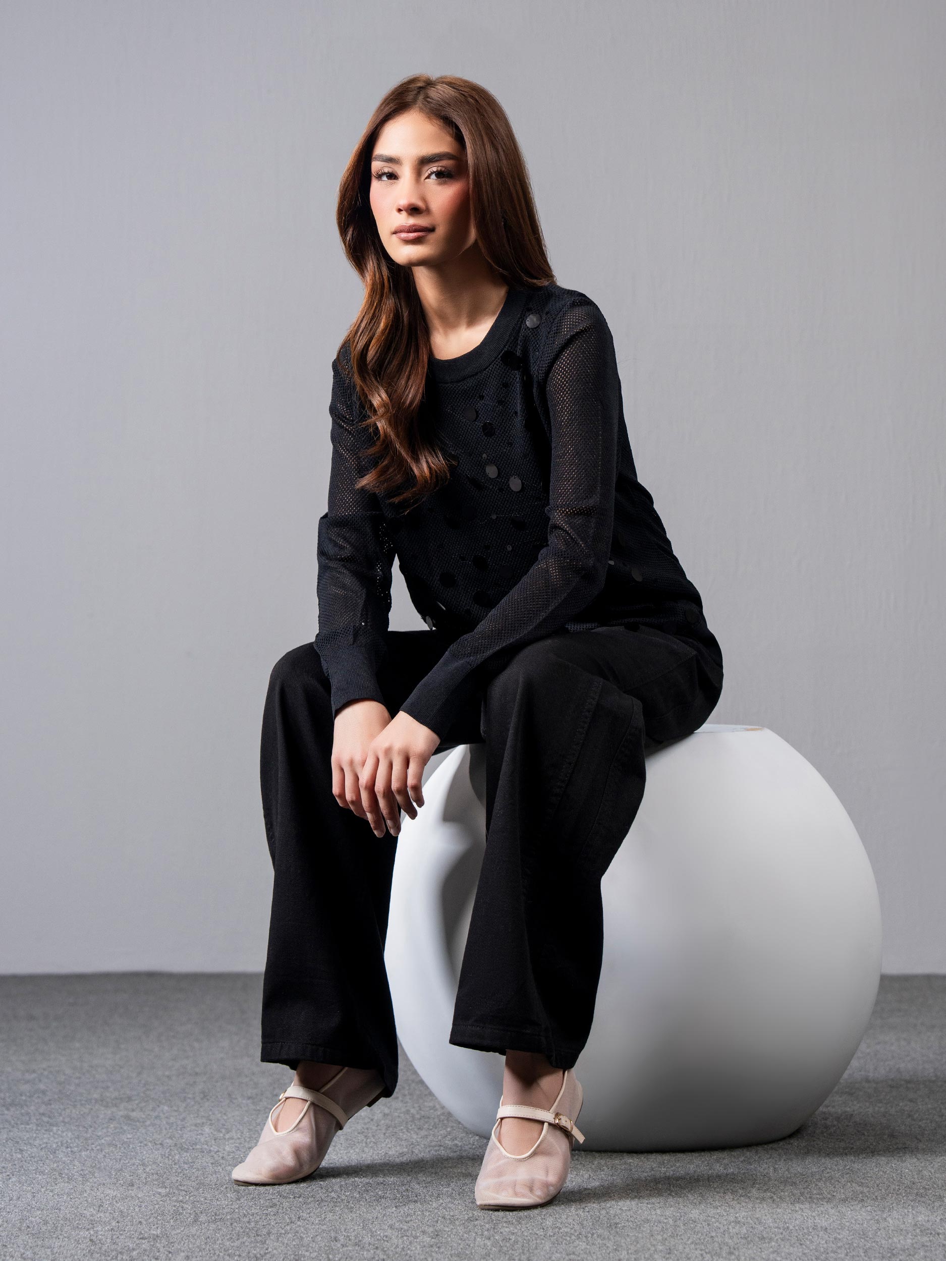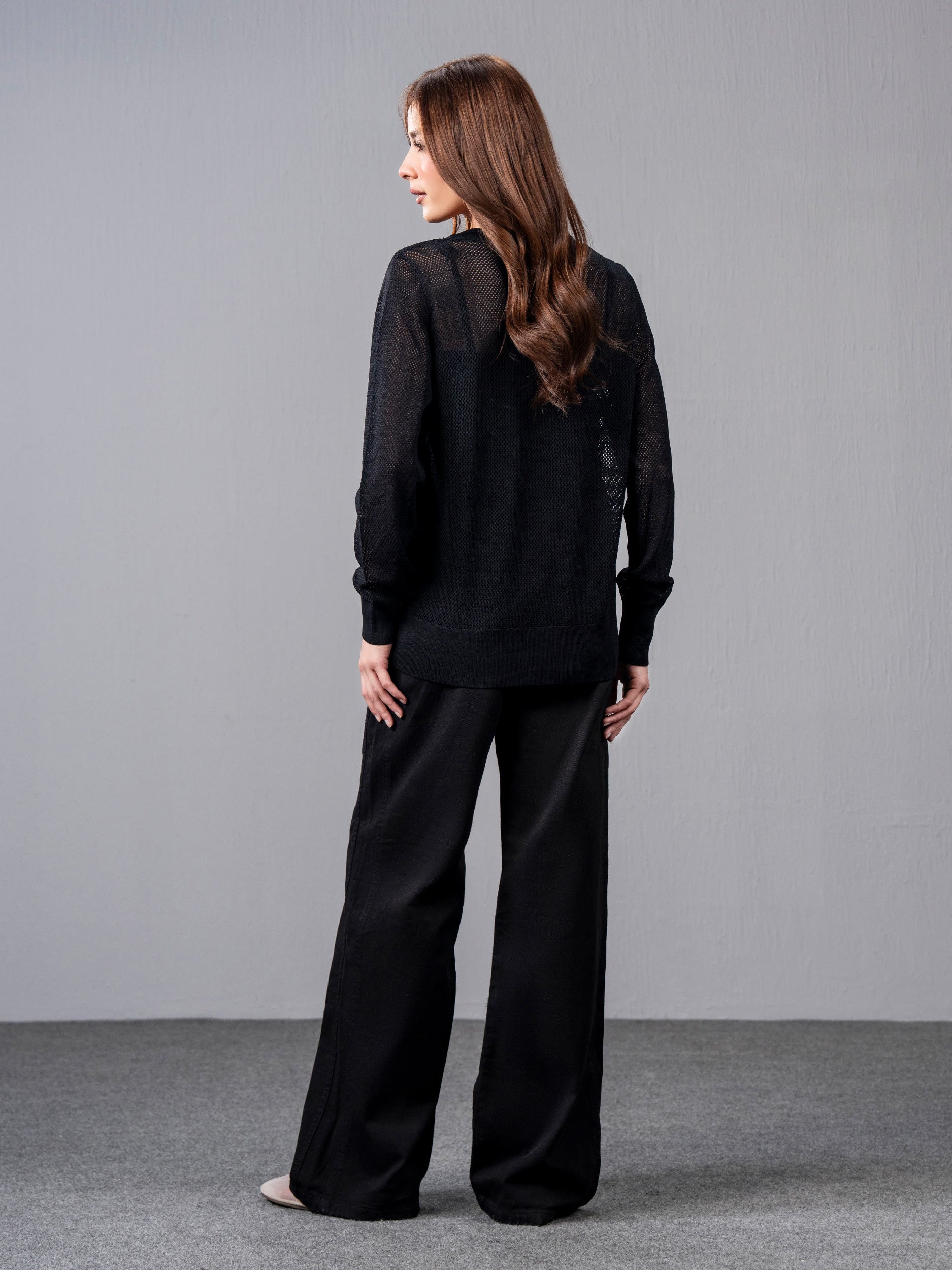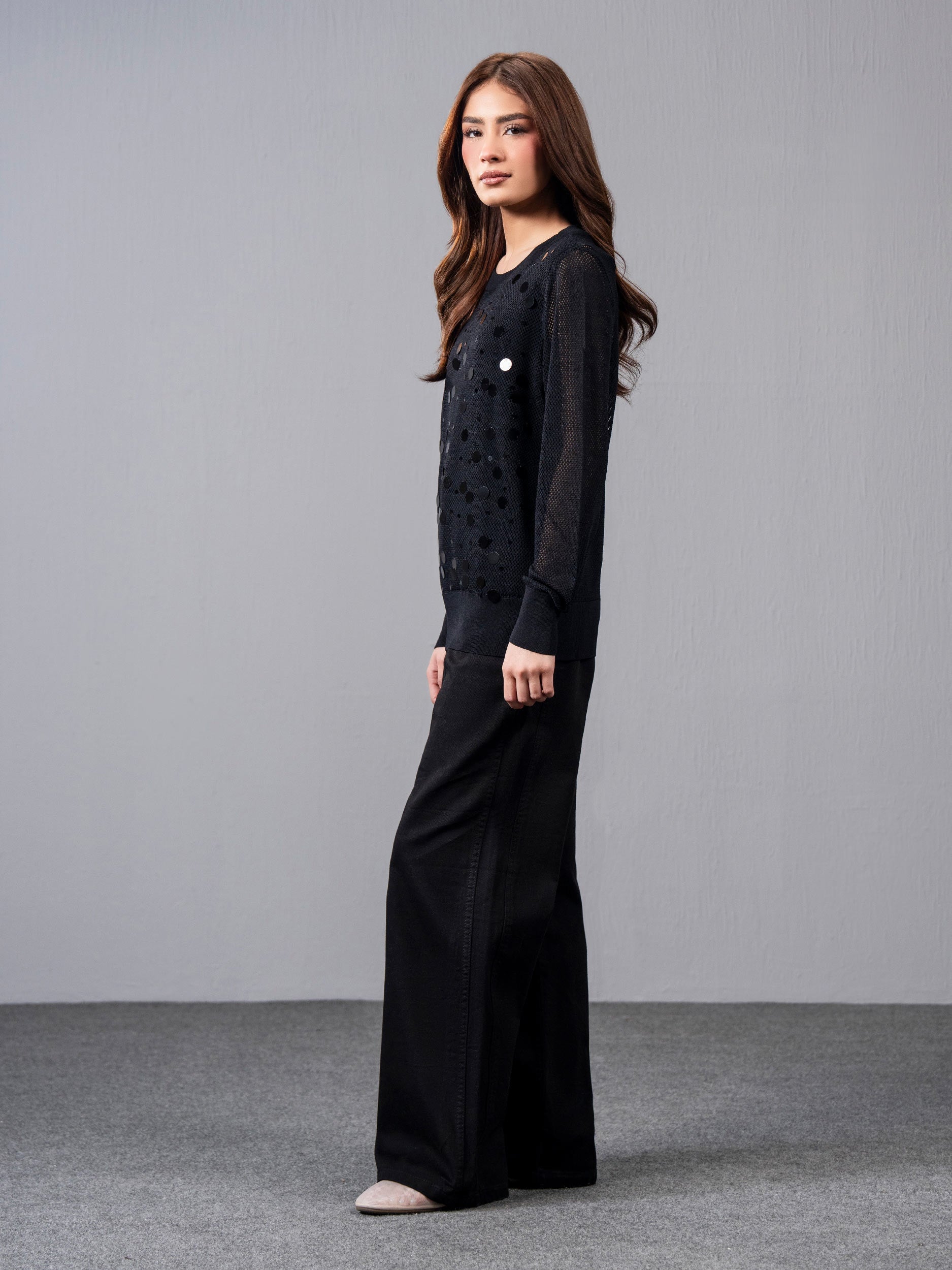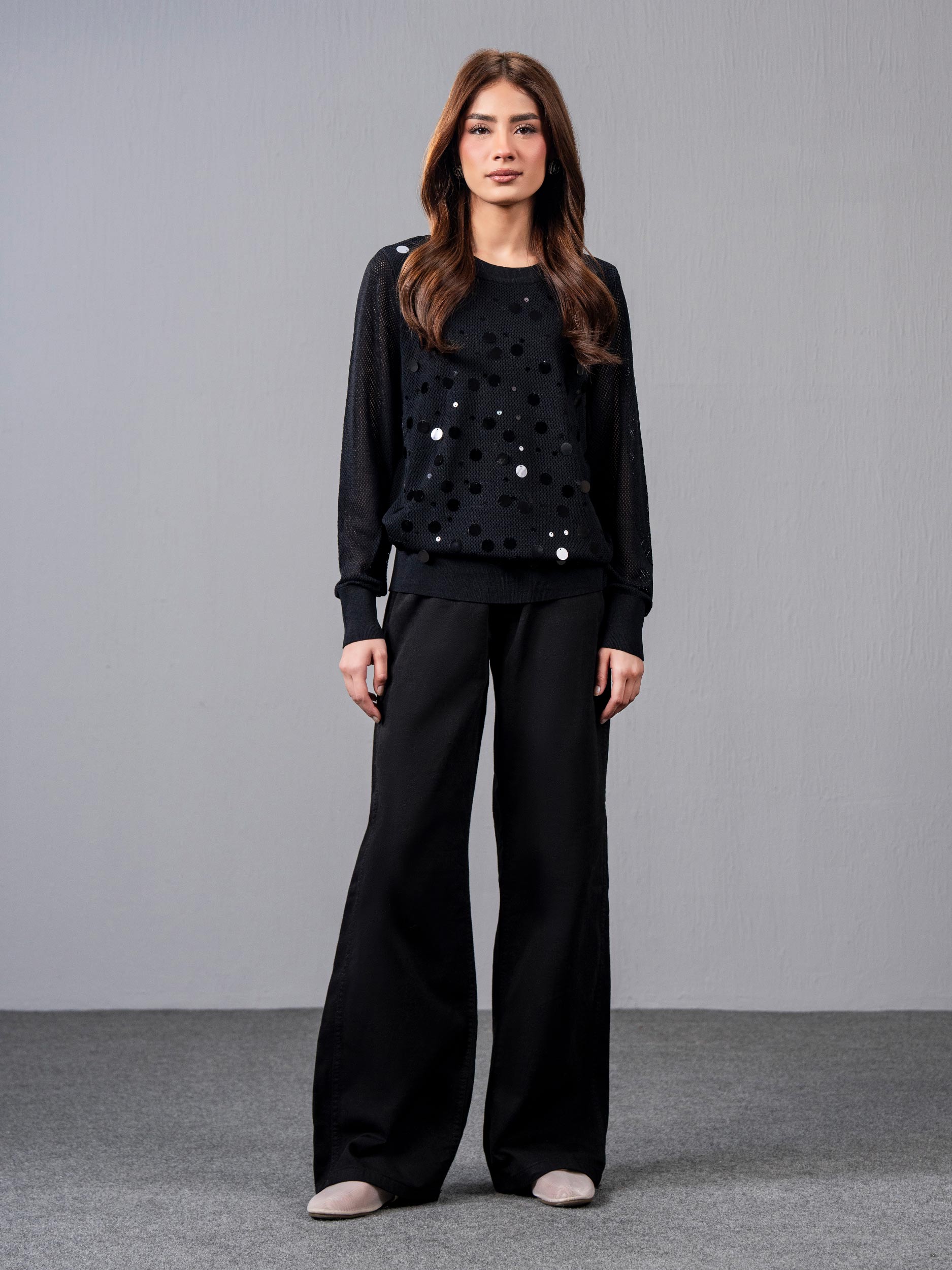 - Sequin-detailed round-neck crochet jumper
