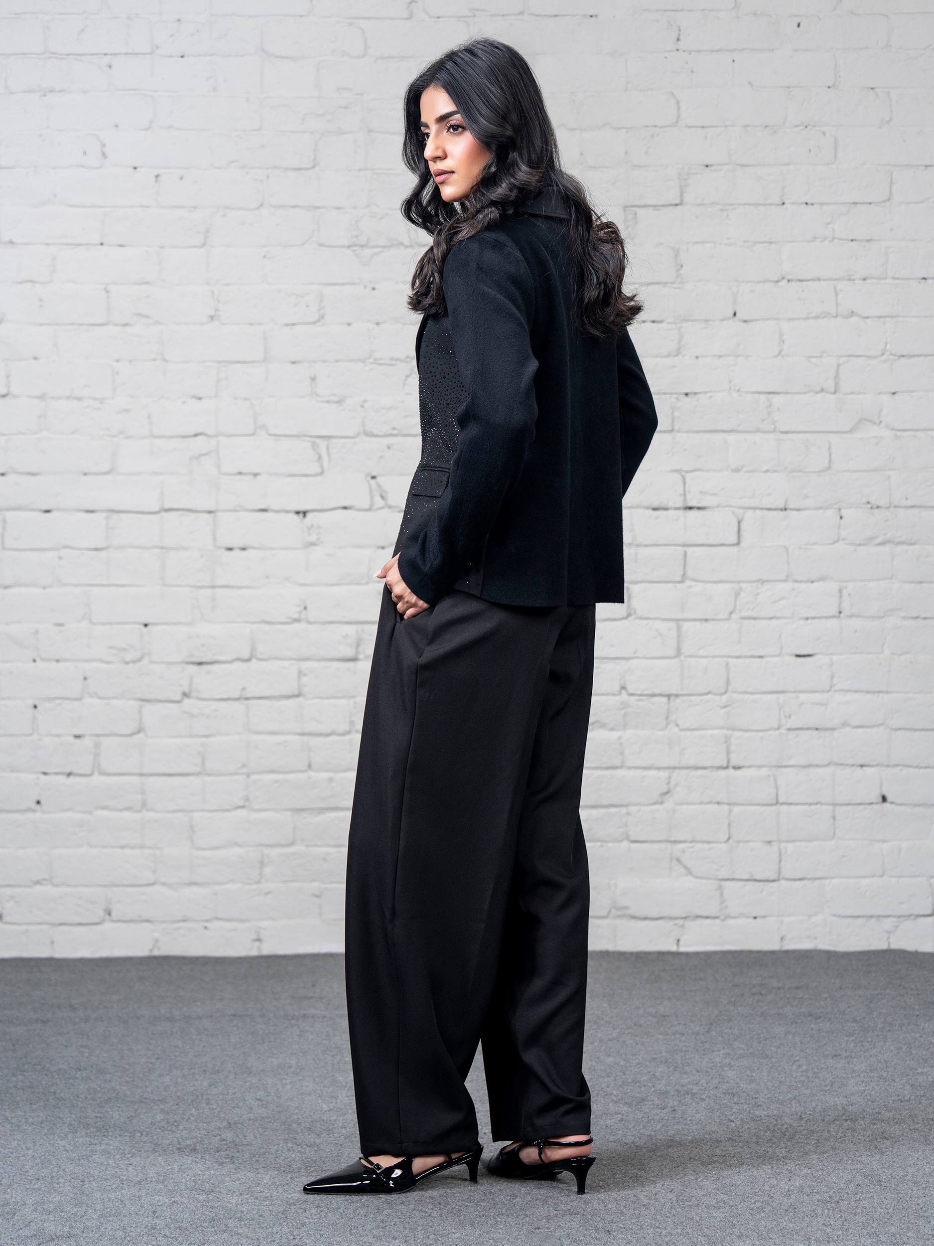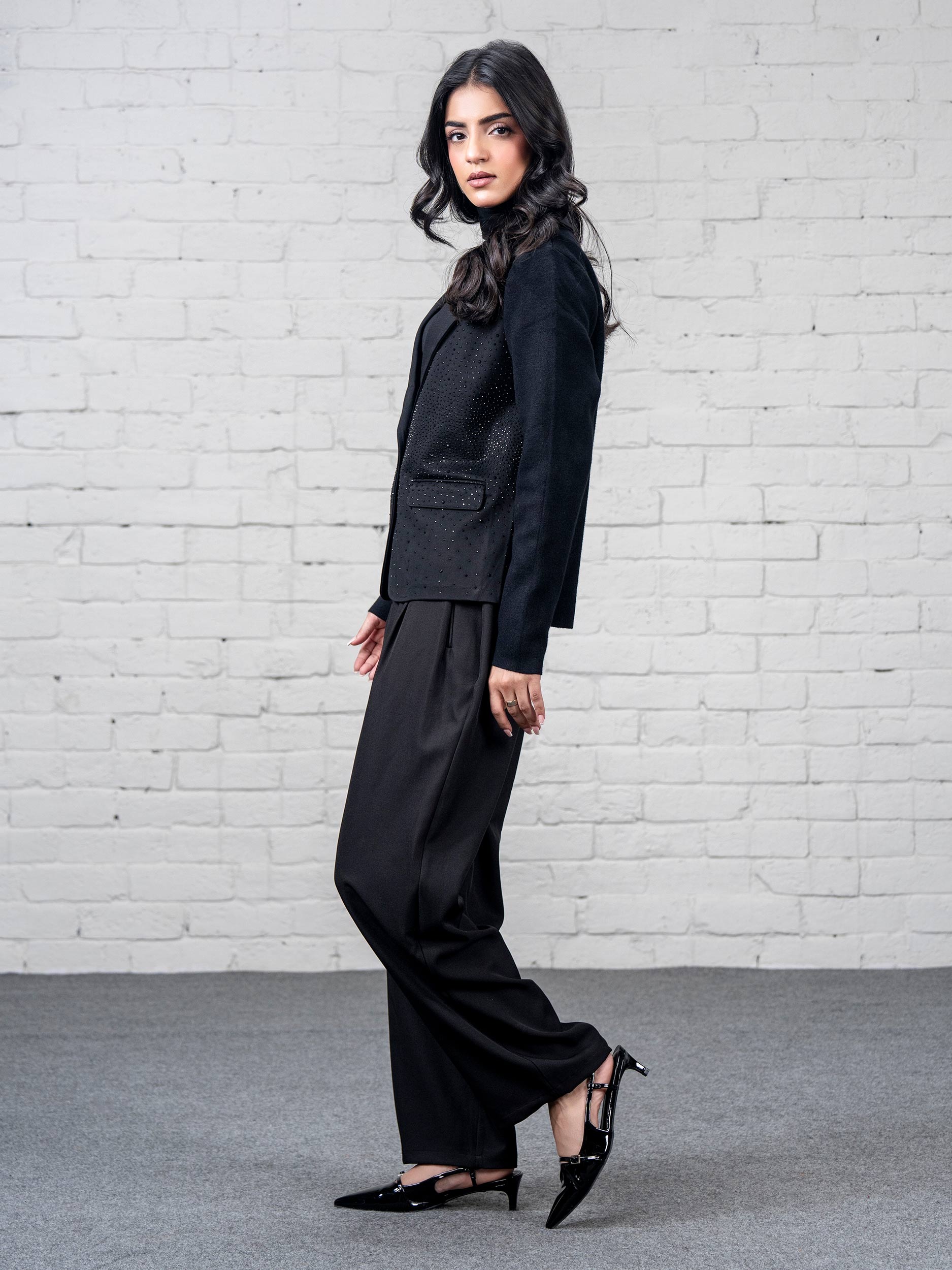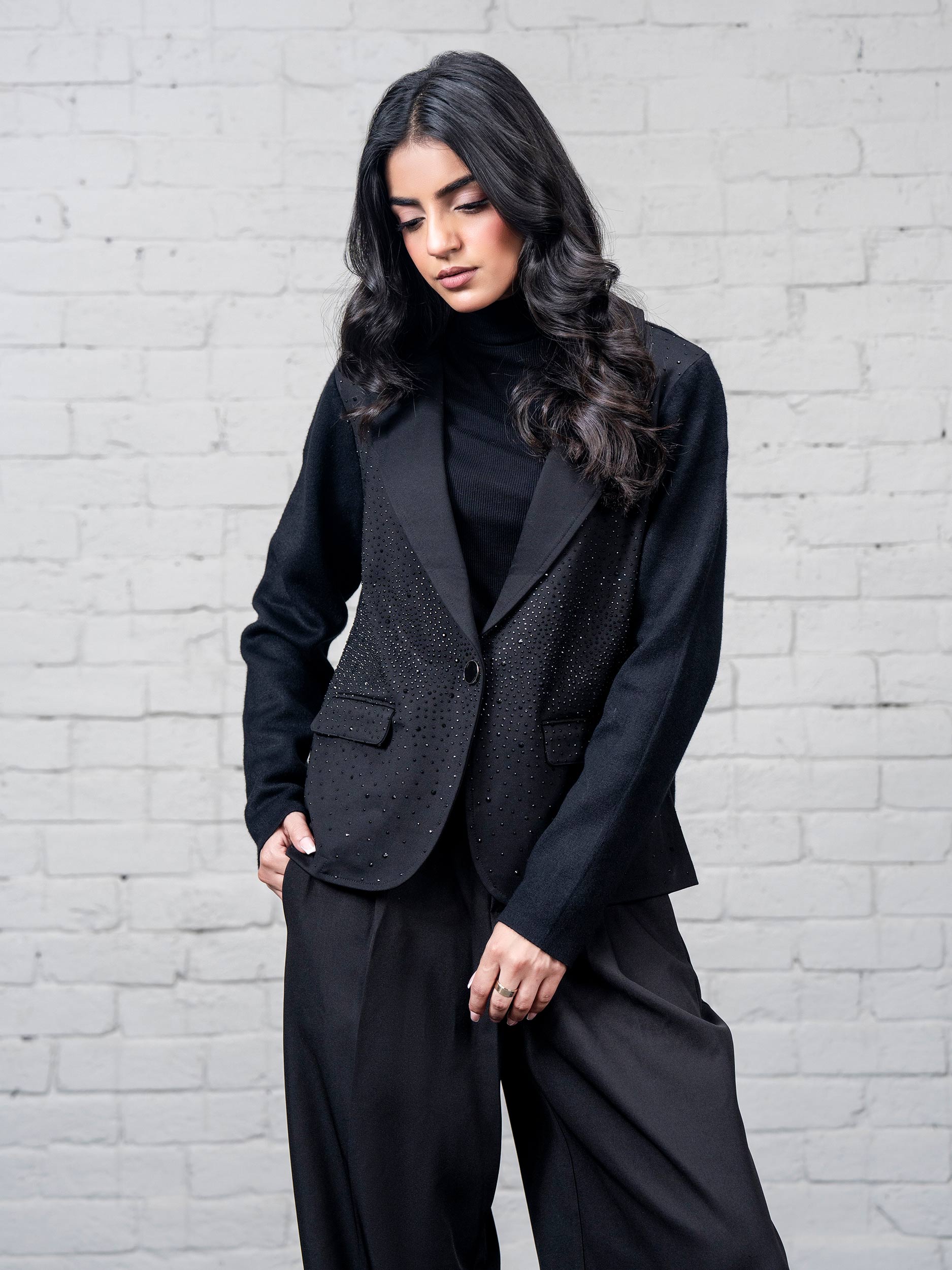 - Rhinestone-embellished tailored blazer with front pockets and button closure