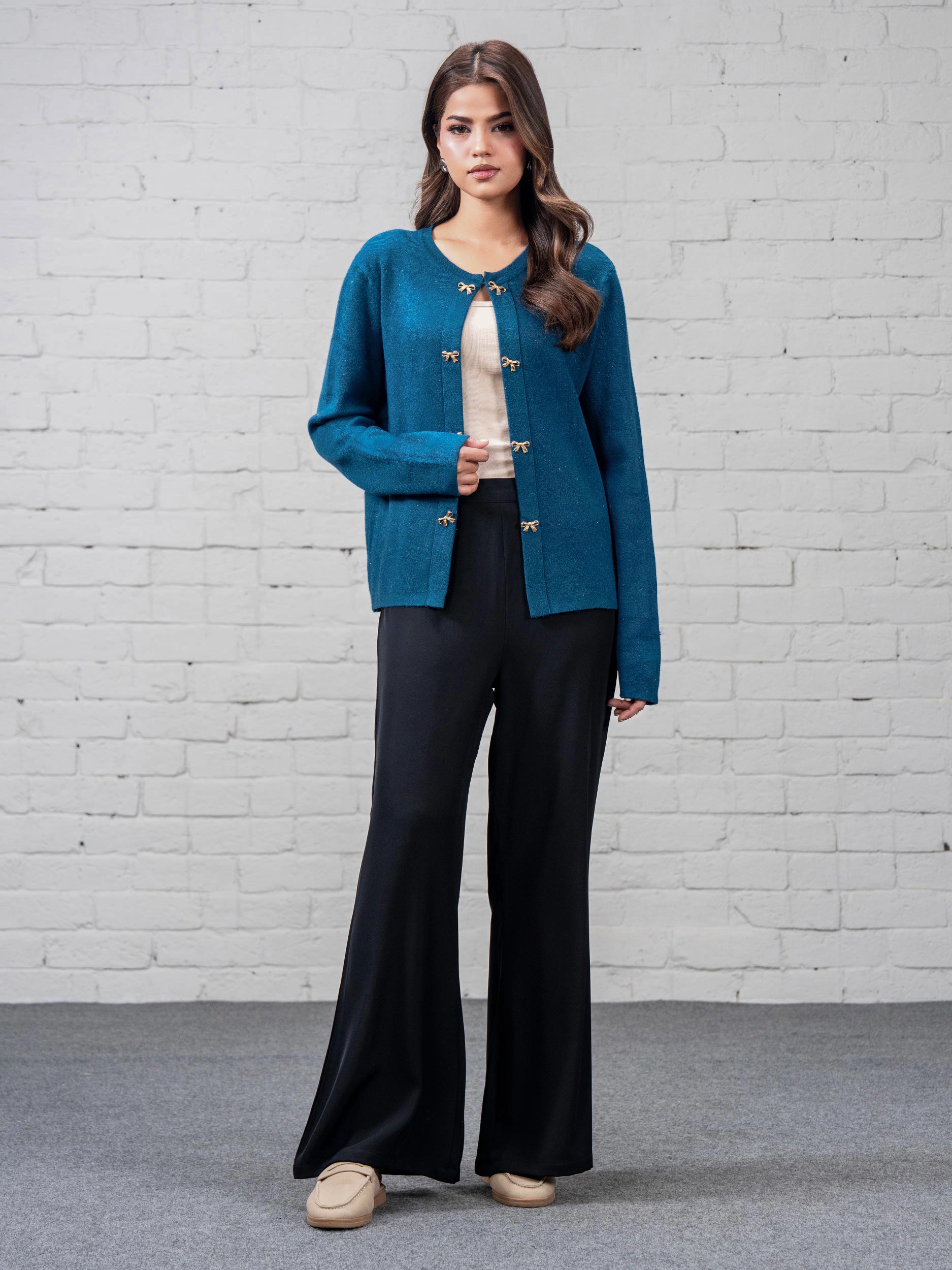 Open-front cardigan with a round neckline and bow button detailing