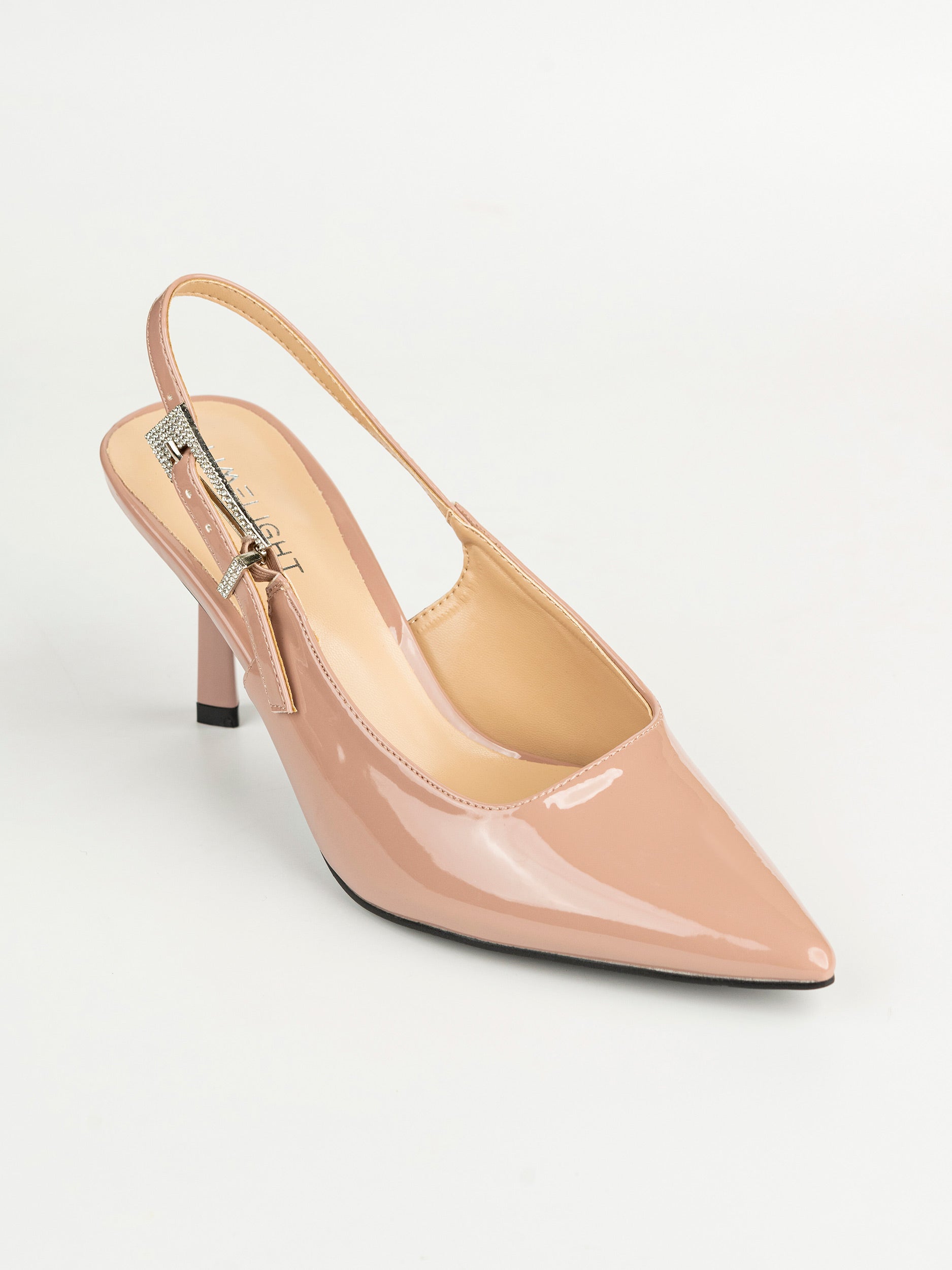 - Glossy slingbacks with adjustable ankle strap and buckle