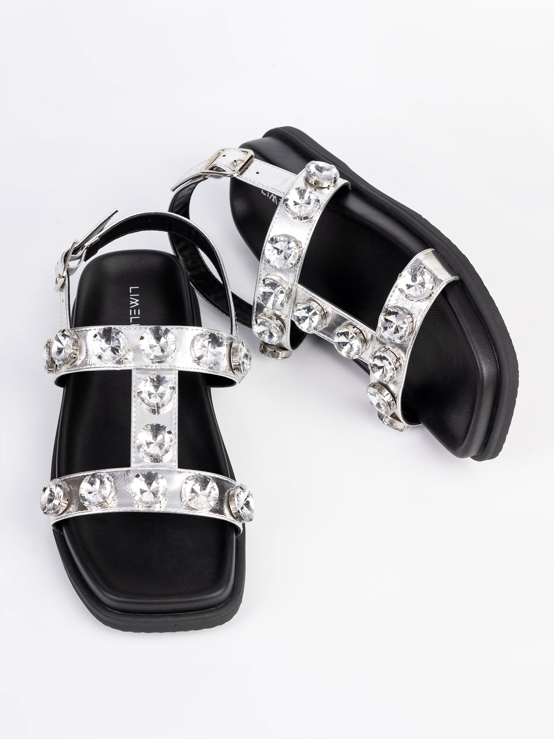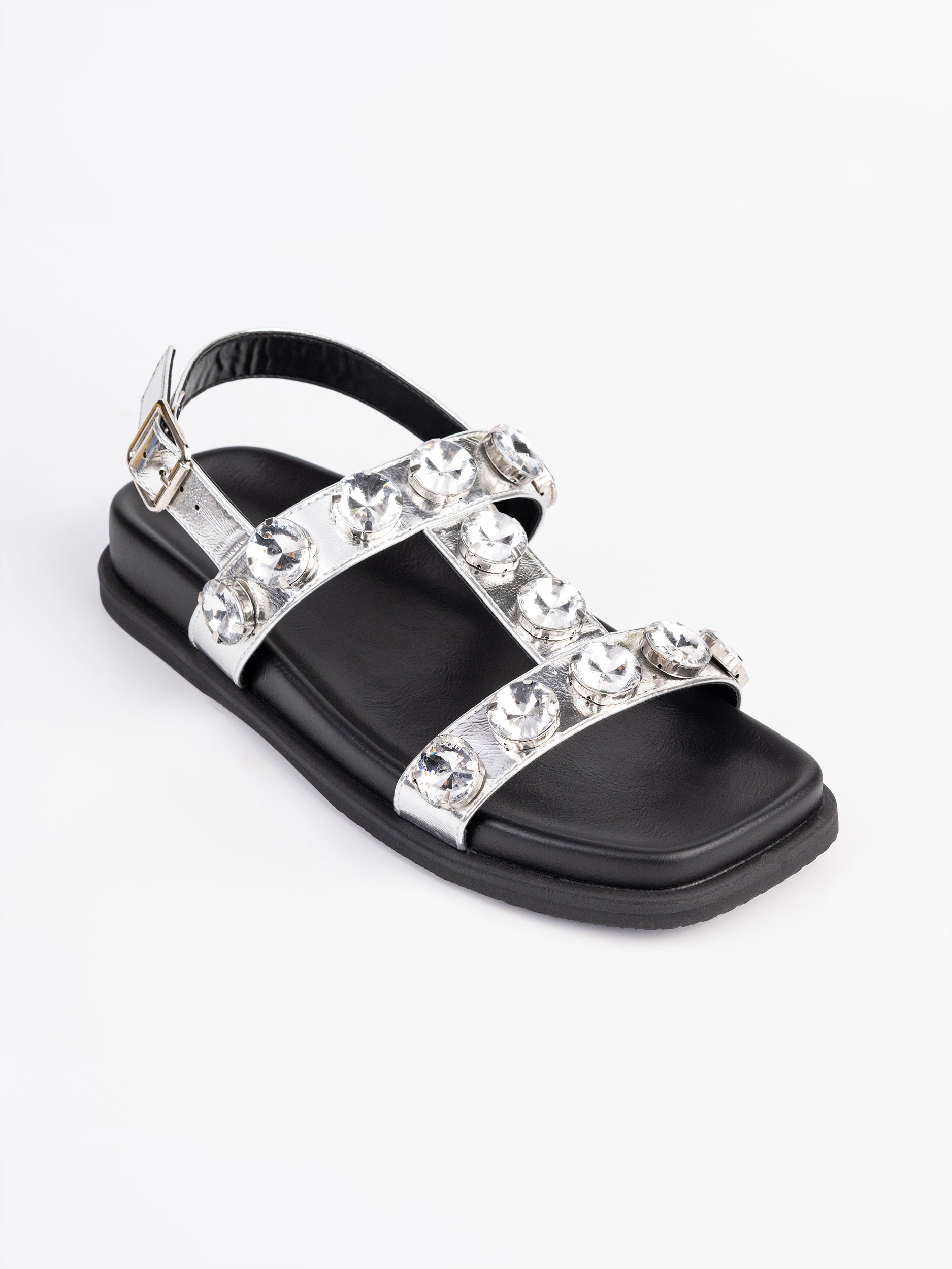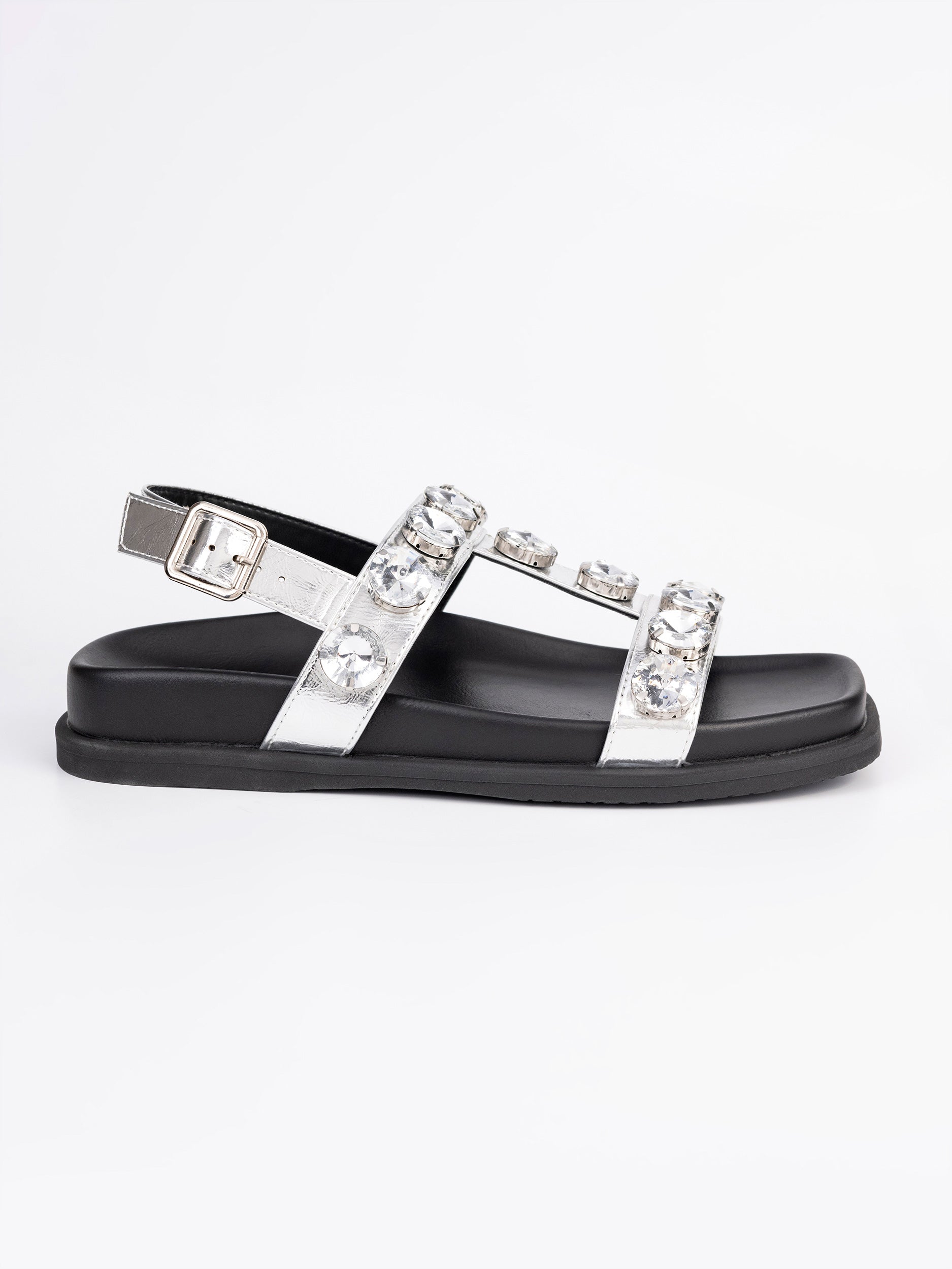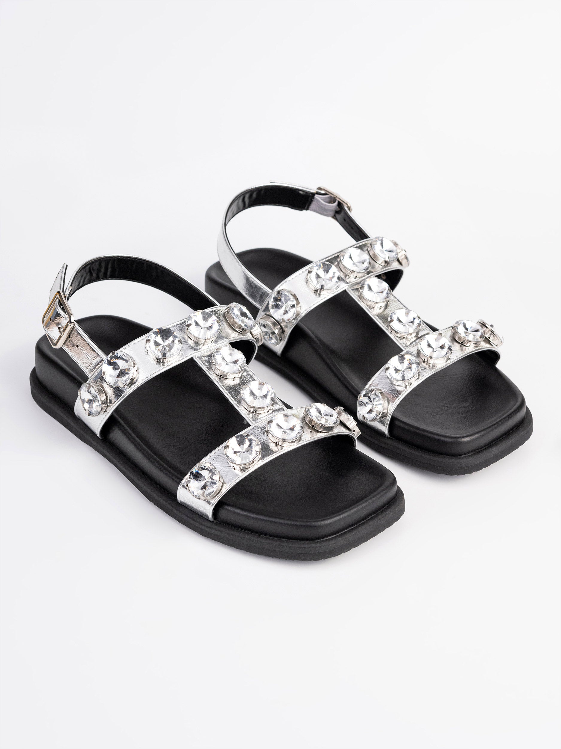Crystal-embellished strap sandals with an adjustable ankle strap and a cushioned sole