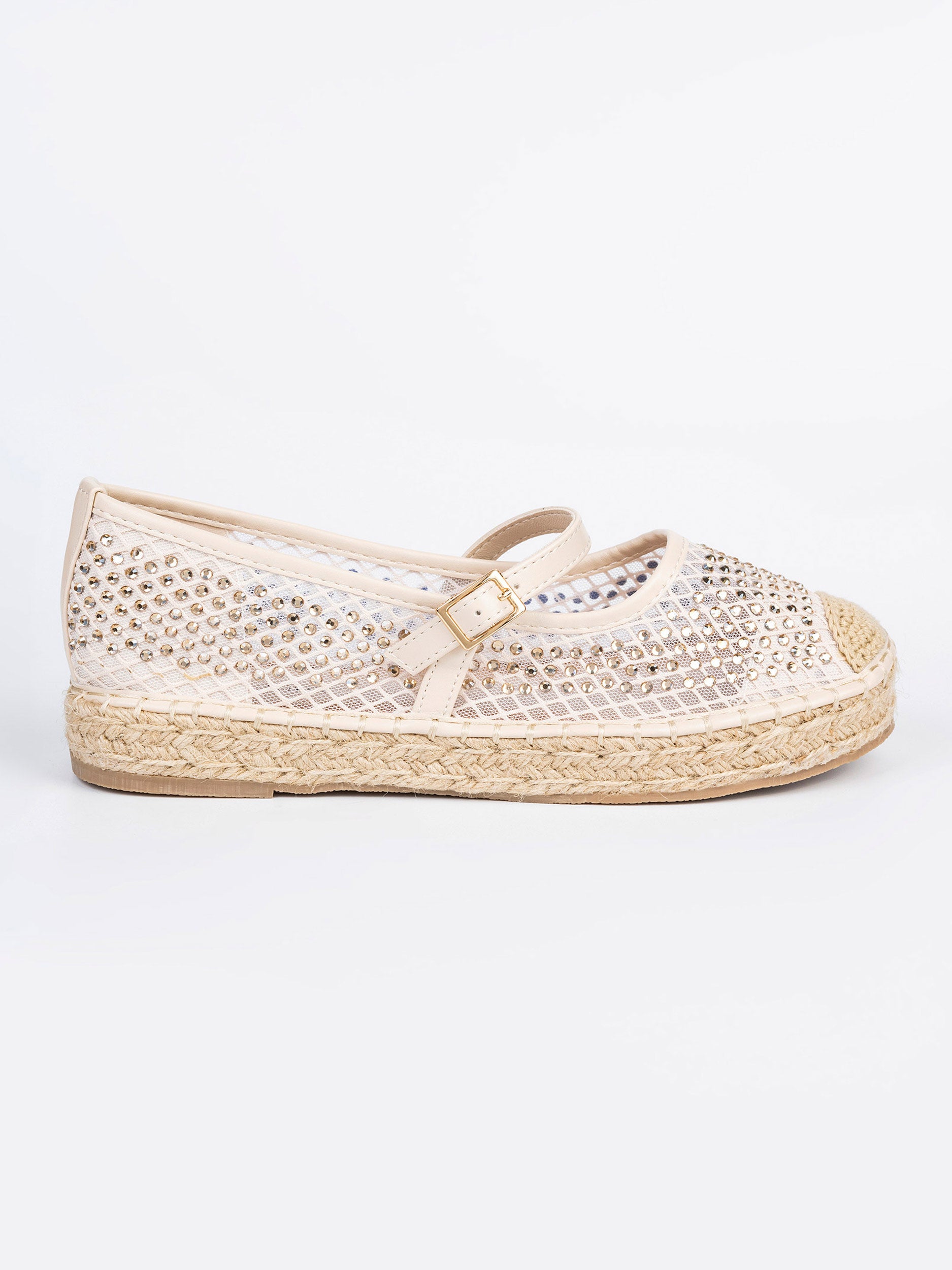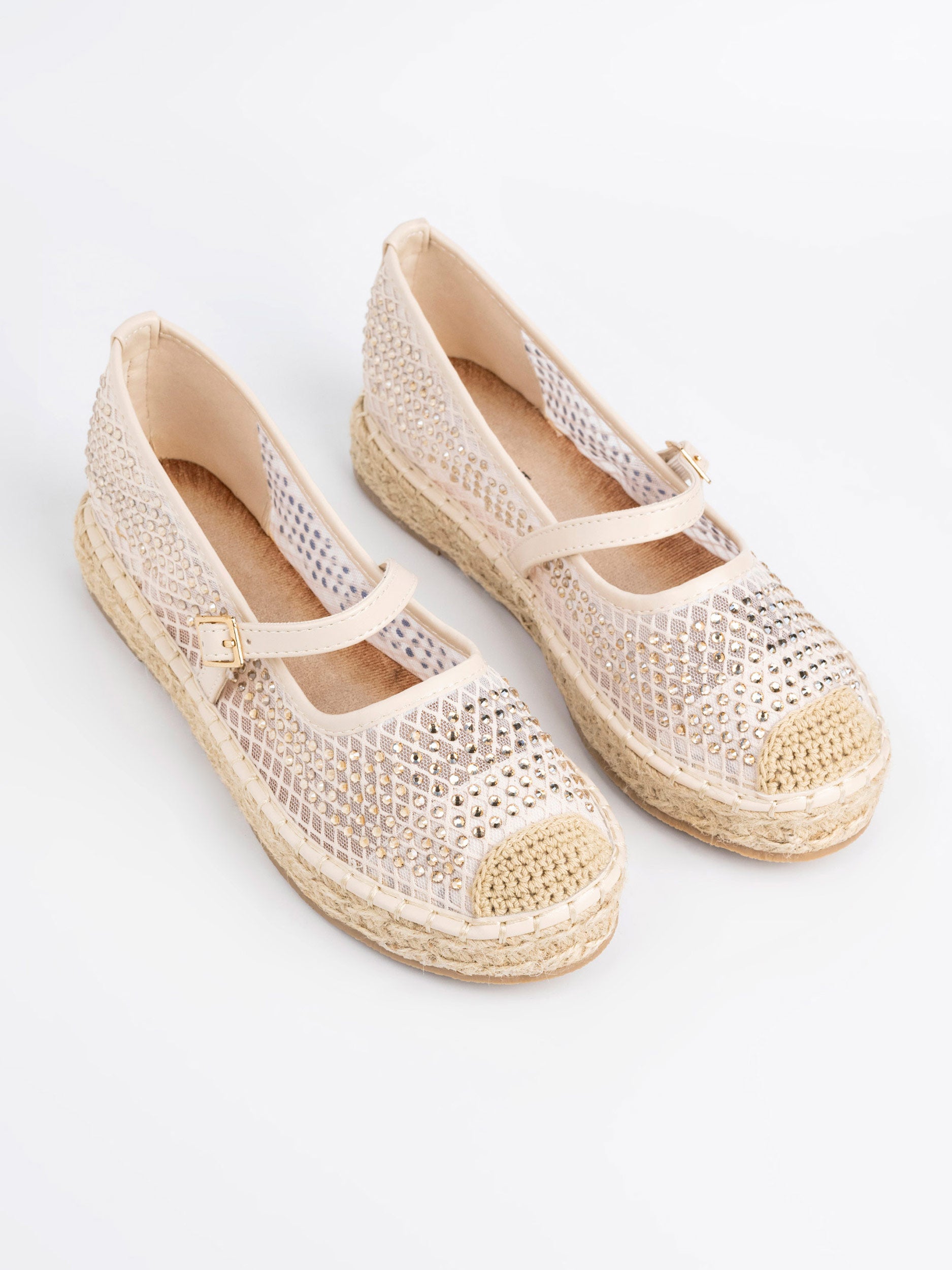 Shoes with a sequin-embellished upper, a buckle strap, and a cushioned sole with jute detailing