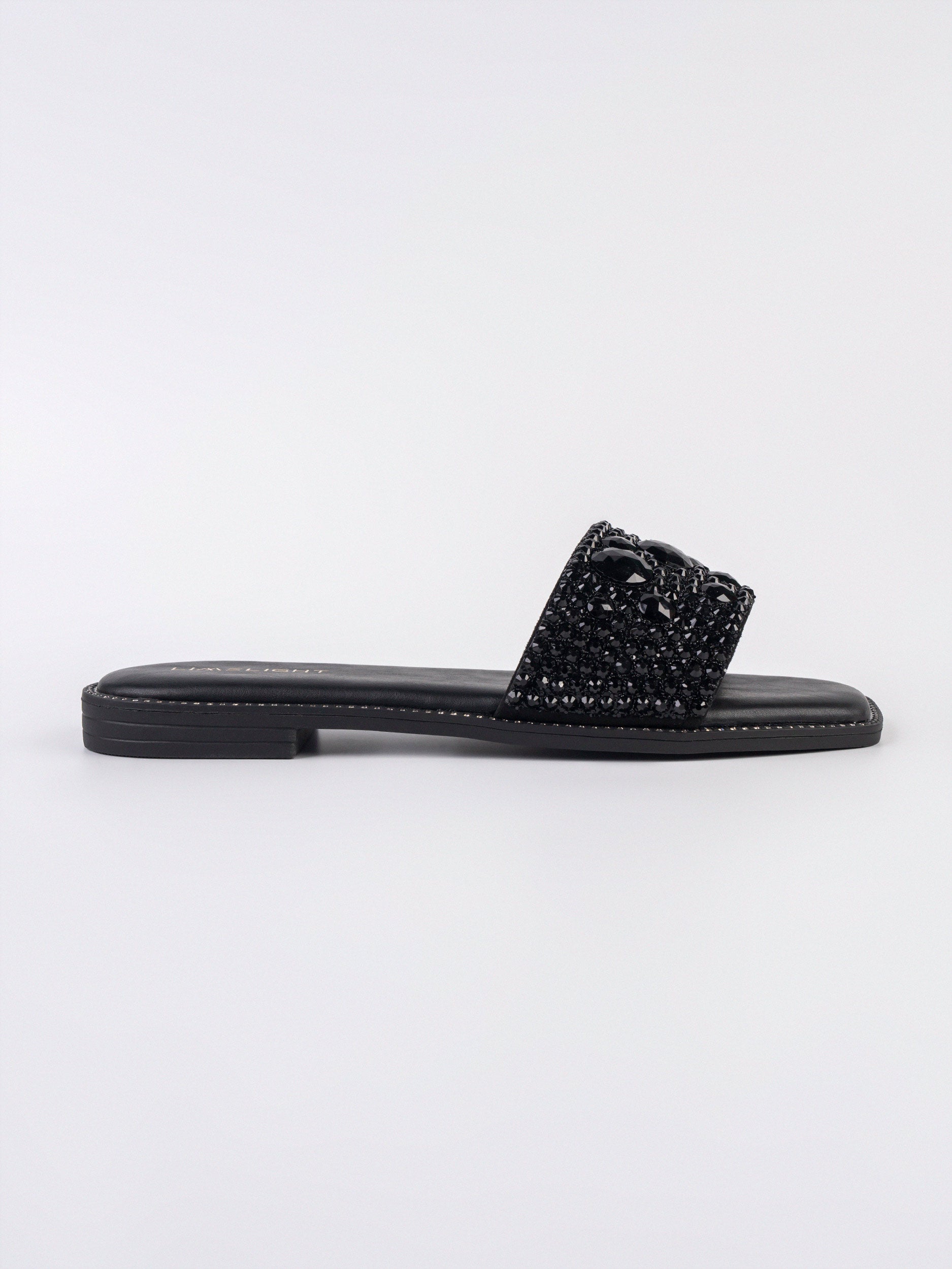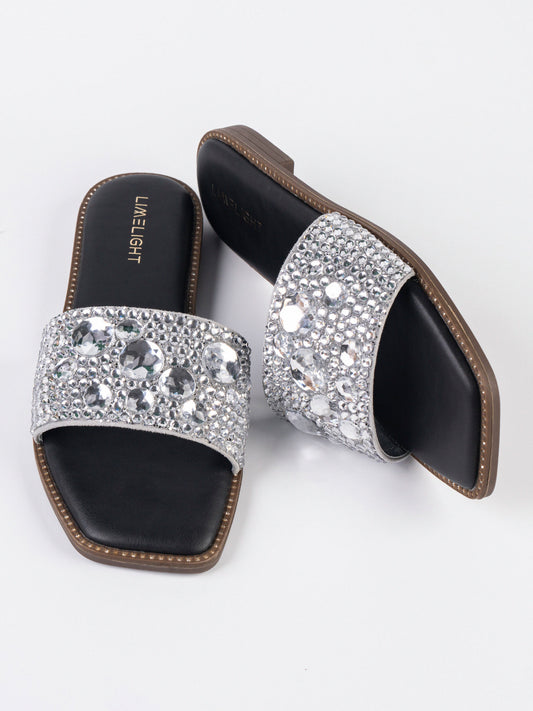 - Rhinestone embellished square toe slides with studded flat sole