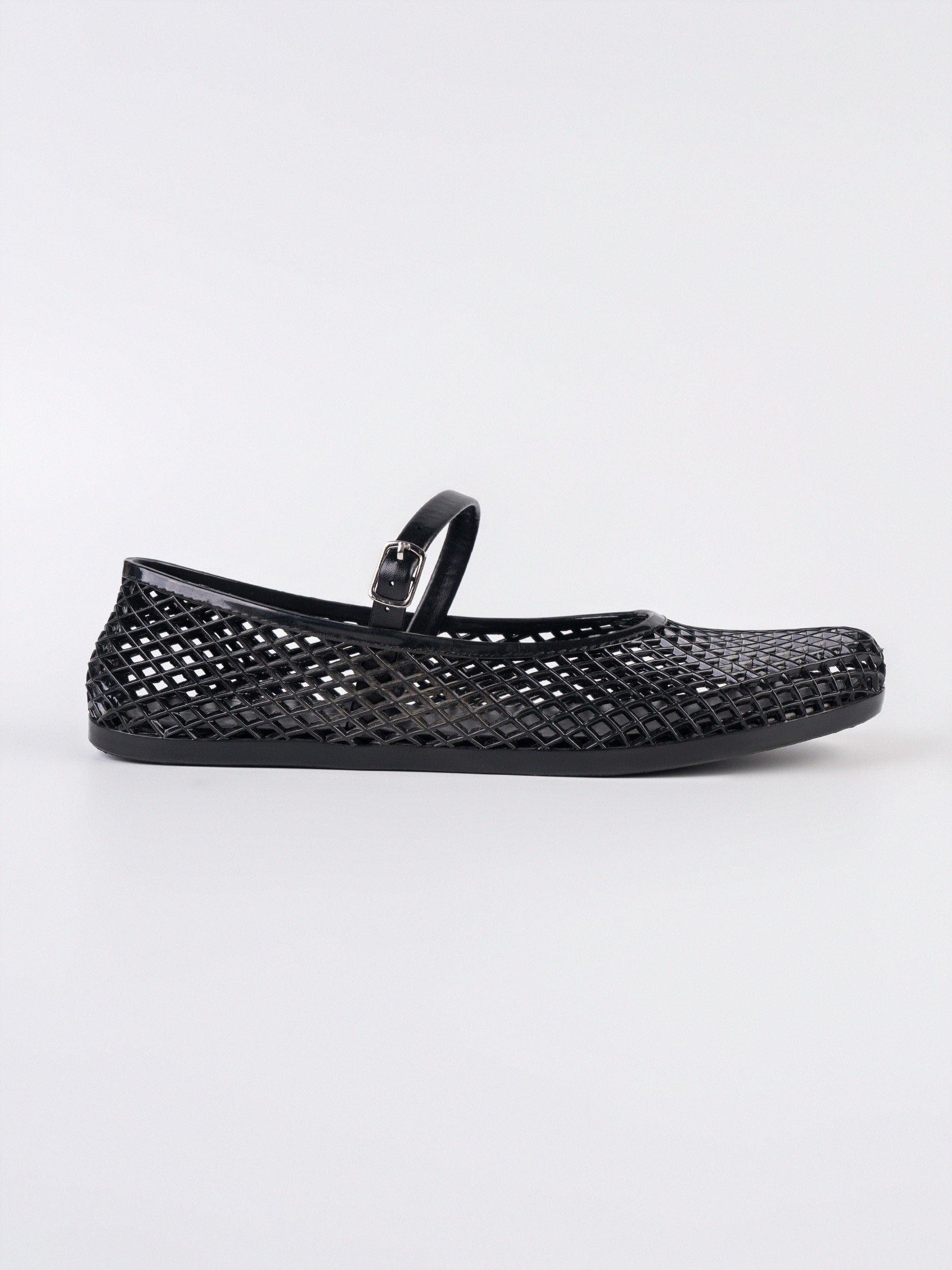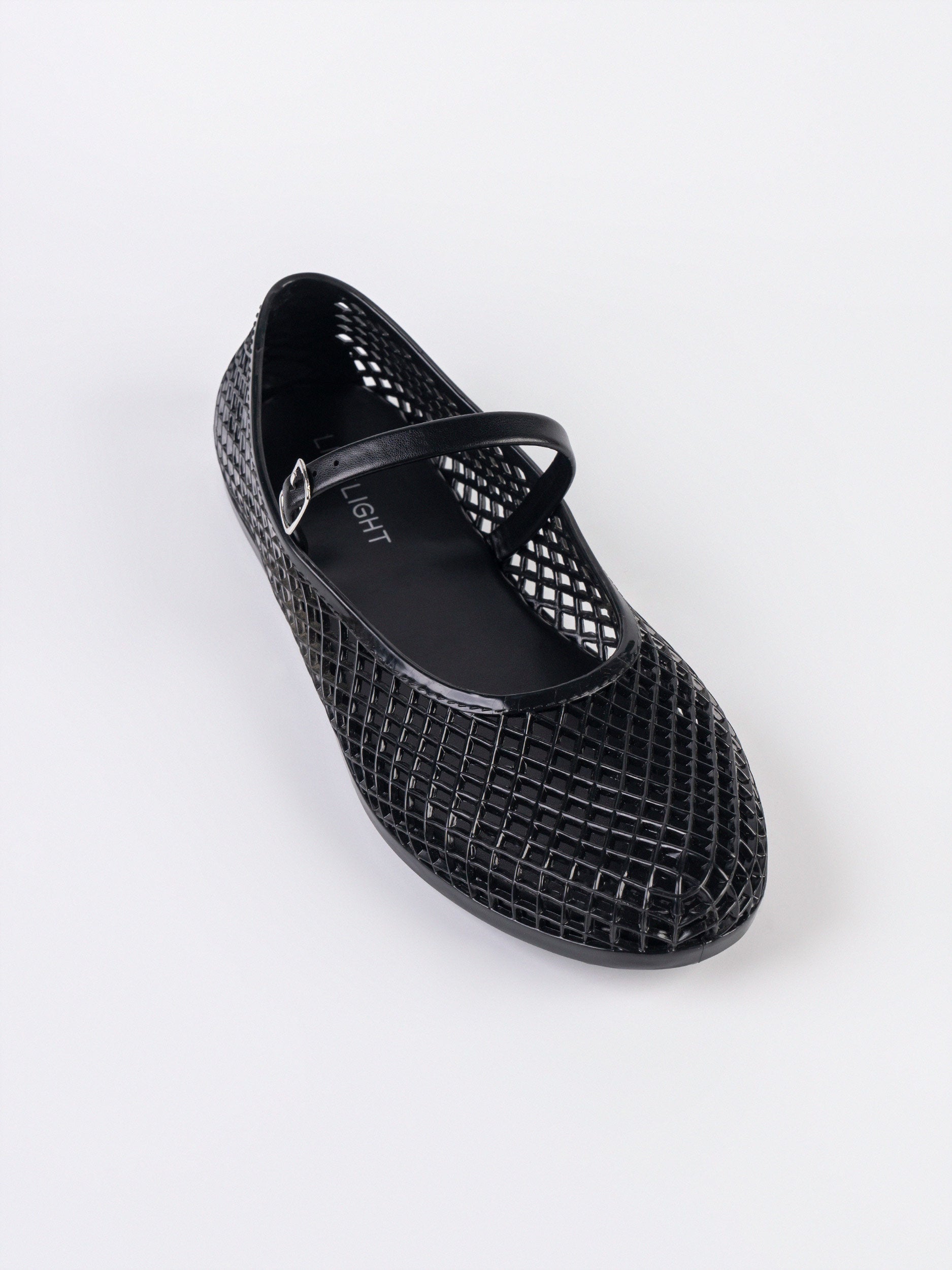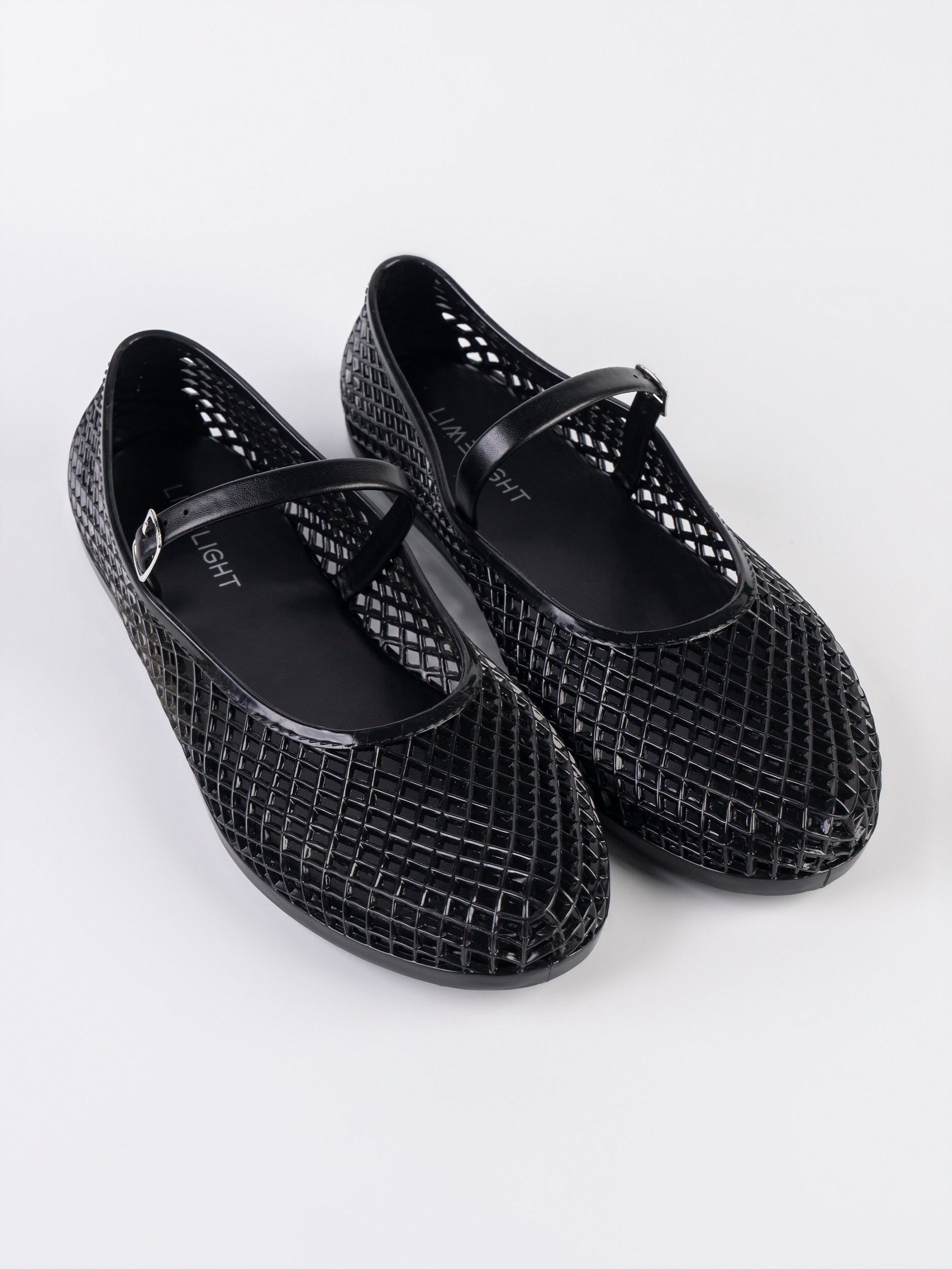 - Cinderella-style glossy pumps with a woven cage upper and strap detail