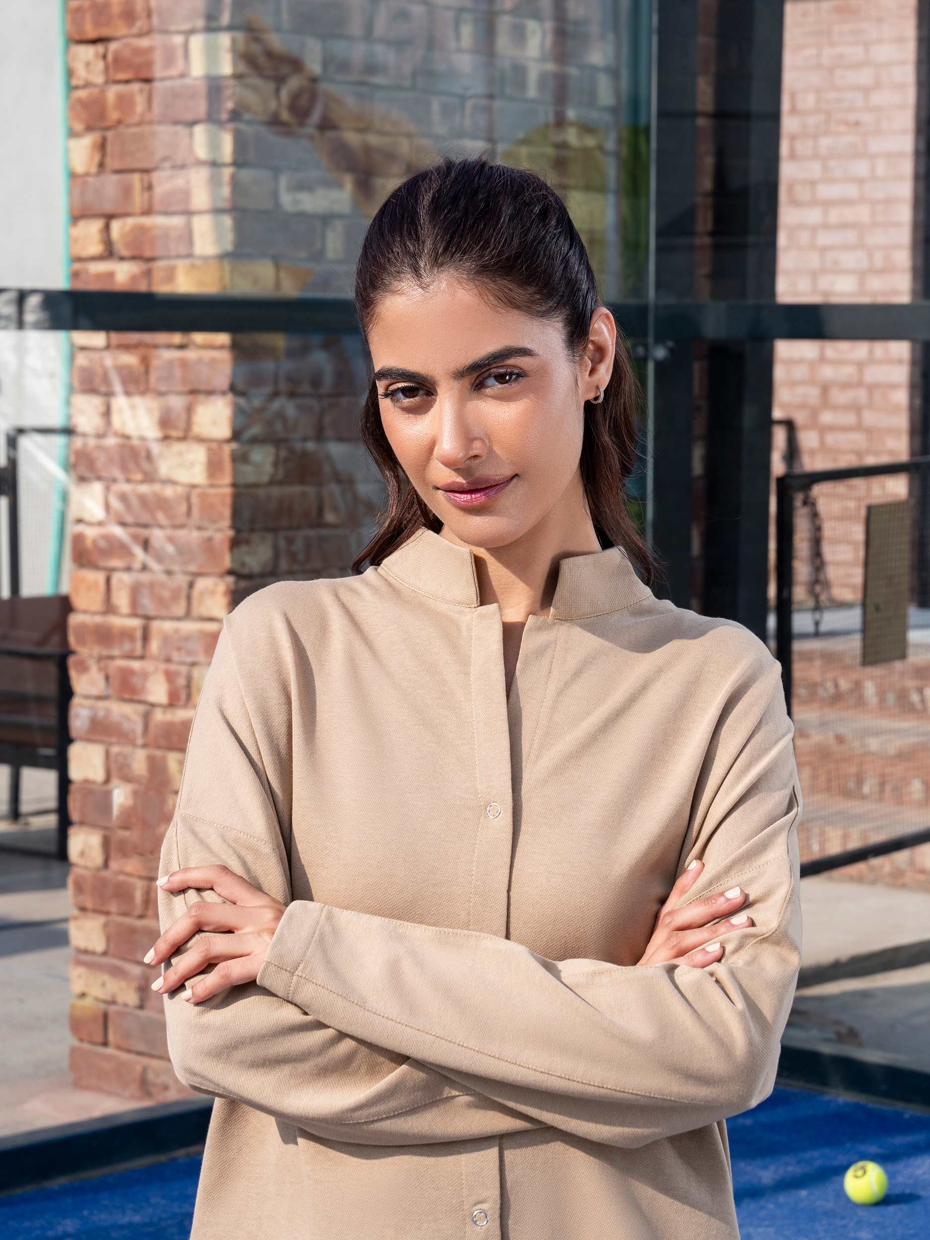 - Collared button-down sweatshirt with cuffed sleeves and a slightly longer back hem